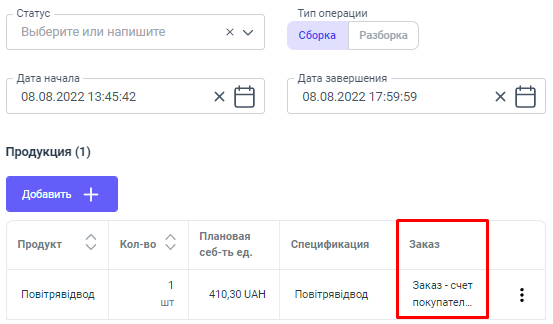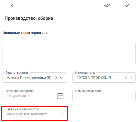 Детальнее о заполнении документа "Производство, сборка" читайте в статье: Создание документа "Производство, сборка"