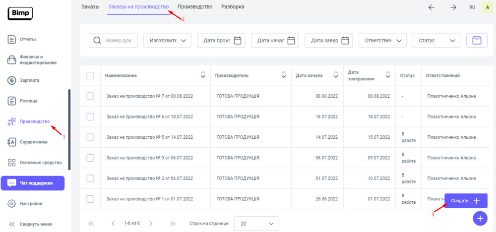 2. Далее, создаем документ "Заказ на производство", в блоке Производство раздел Заказы на производство нажав на кнопку "Создать", или