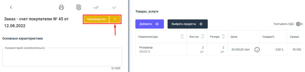 1. После создания спецификации в блоке Справочники разделе Спецификации, необходимо создать документ "Заказ — счет покупателю", и в данном документе оформить продажу продукции, которую мы хотим произвести (без резерва на продукцию), а также присвоить документу статус — Производство.