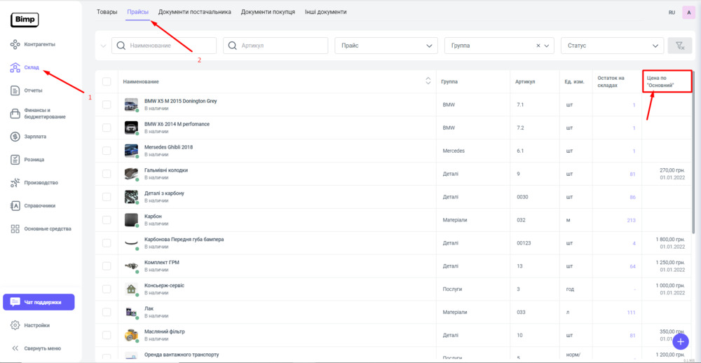 Переходим в блок Склад, раздел Прайсы. Мы можем видеть, что в данном разделе у нас тянутся прайсы лишь Основные. Вот почему нам так важен статус Основной, он тянет информацию в прайсы лишь по основным.
