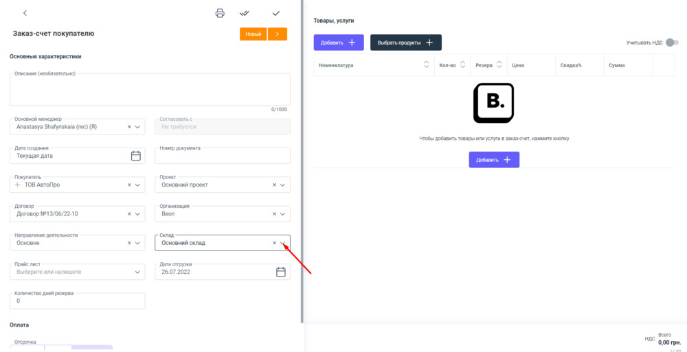 Перед нами открывается рабочее поле документа, где в строке Склад, автоматически подтянулся Основной. Мы можем изменить на другой, но автоматически всегда будет подтягиваться в первую очередь Основной склад.