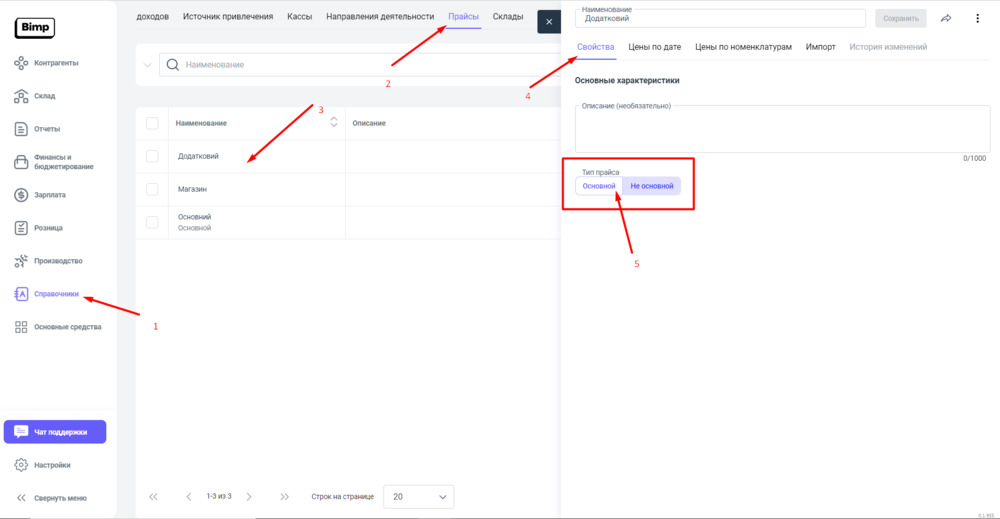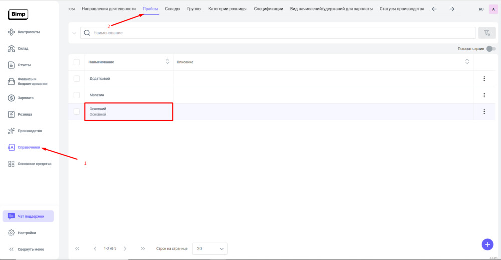 Переходим в блок Справочник, раздел Прайсы. Видим, что у нас есть Основной прайс.