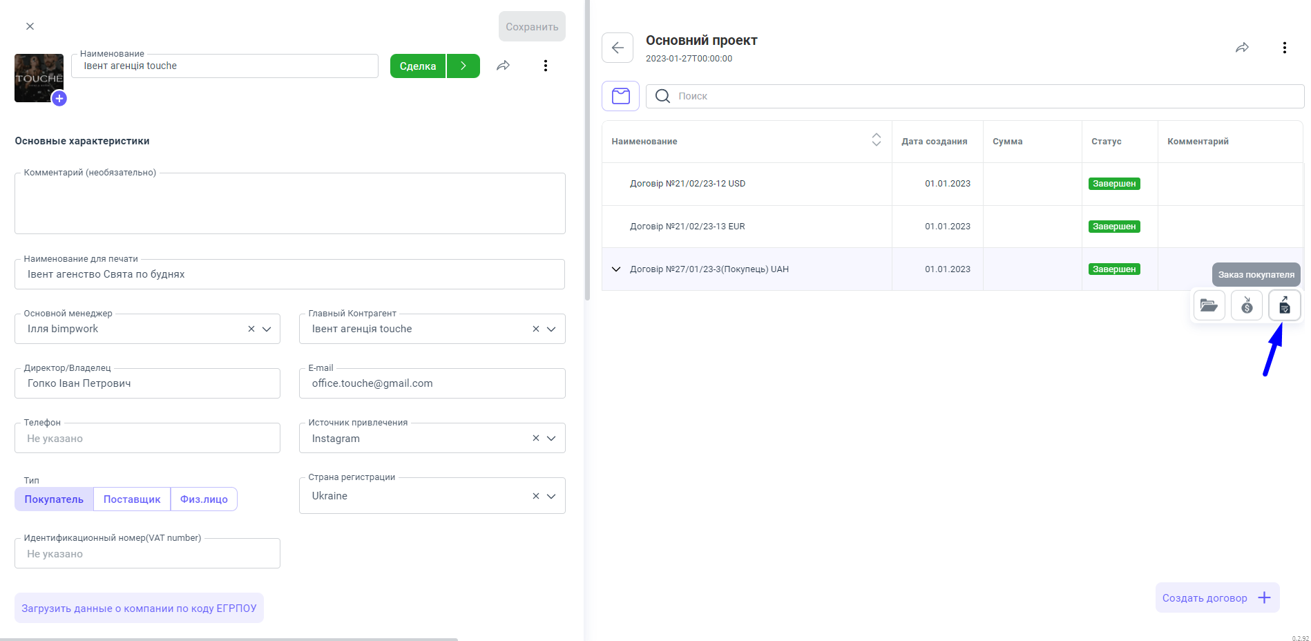Переходим в блок Контрагенты, выбираем необходимого контрагента (покупателя или поставщика), открываем его карточку. Выбираем нужный нам проект (в правой части экрана).