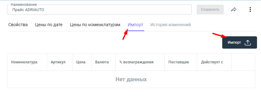 4. После создания карты прайса комиссионера, перейти в ней во вкладку Импорт и нажать на кнопку "Импорт".