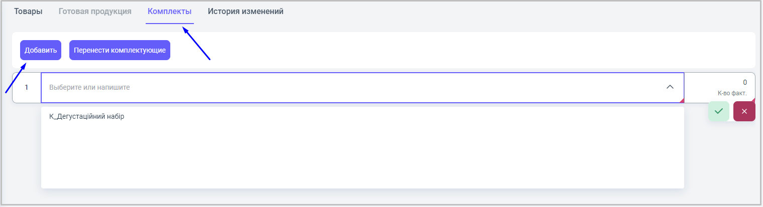 - К-во факт. компл. - данное поле автоматически заполняется после выбора требуемого комплекта во вкладке Комплекты;