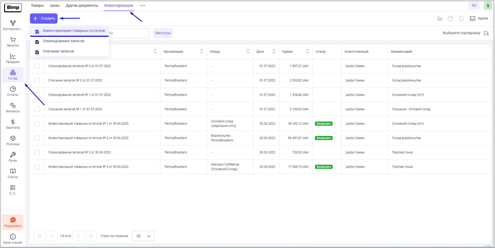 1. Переходим в блок Склад, раздел Инвентаризация и нажимаем кнопку "Создать" и выбираем документ "Инвентаризация товарных остатков".