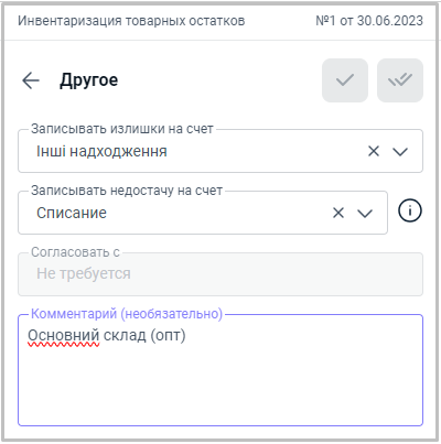 - Записывать недостаток на счет – выбираем на какую статью расходов запишутся излишки по складу;