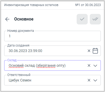 - Ответственный – указываем кто из пользователей ответственен за проведение инвентаризации или система укажет того пользователя, кто создал данный документ, самостоятельно.