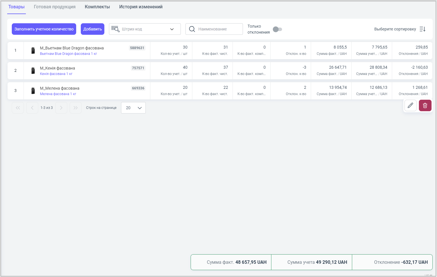 - Отклон. к-во.– данное поле сервис заполняет автоматически, отняв "количество фактическое", "количество в продукции" и "количество в комплектах" от "числа учетной";