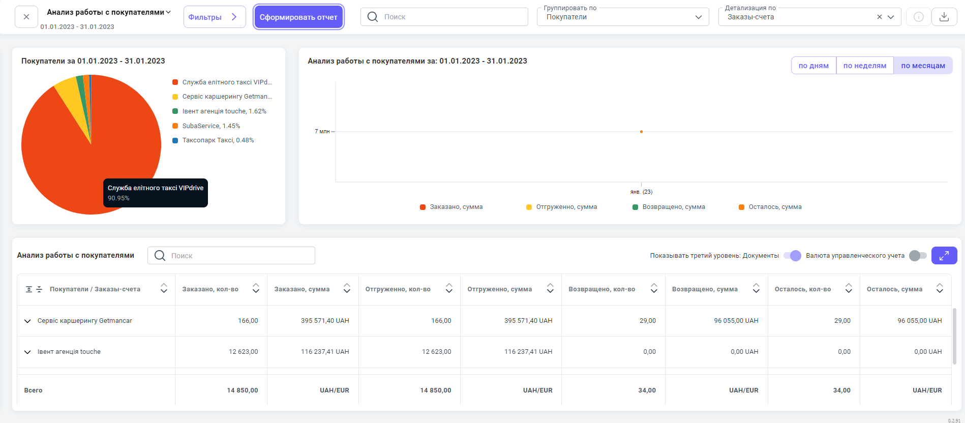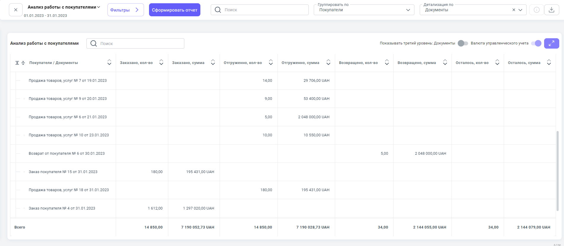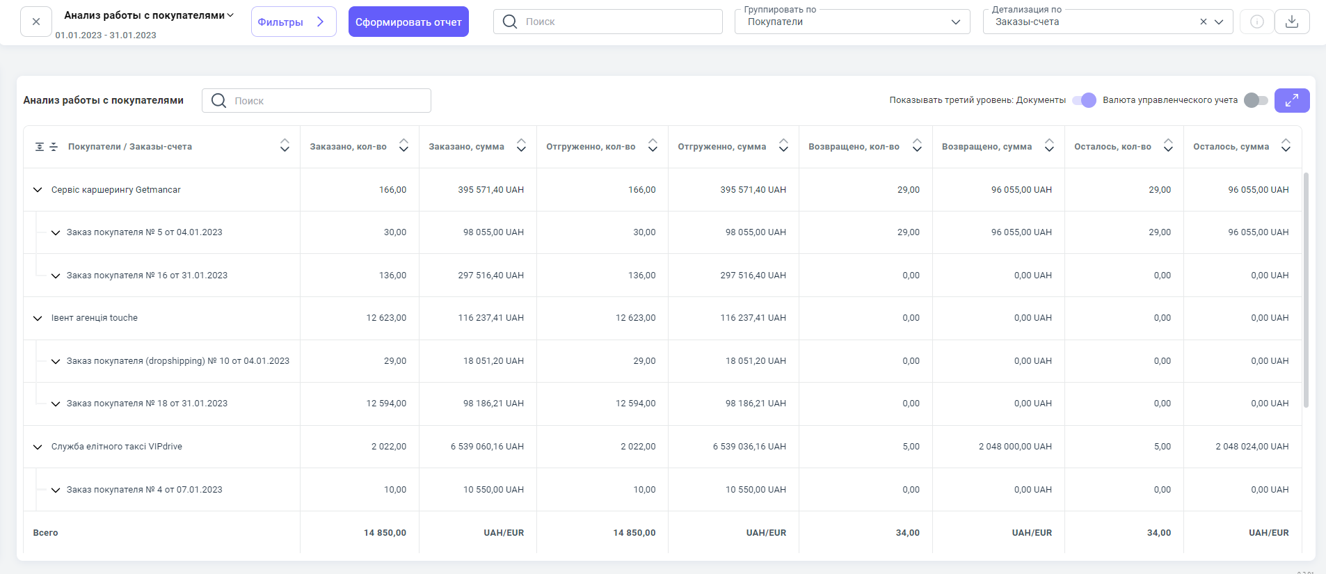 В отчете Анализ работы с покупателями выводятся данные за заданный период о товарах, которые были заказаны, отгружены, возвращены, а также сколько еще товара осталось отгрузить, чтобы в полной мере выполнить условия заказа.