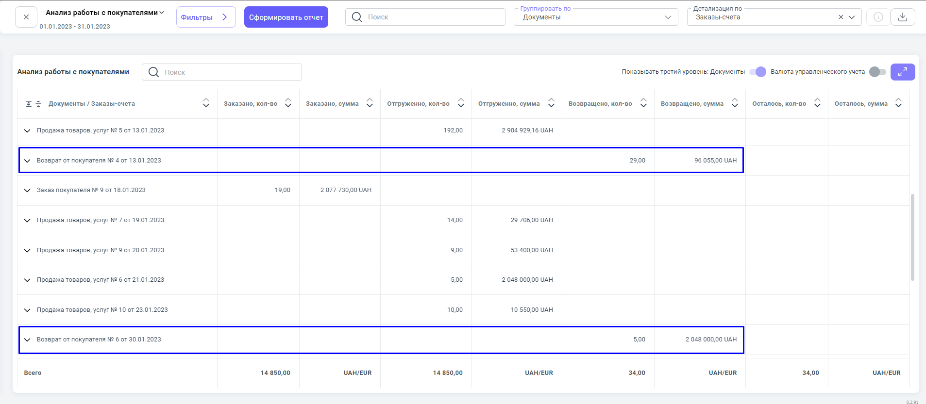 - "Возврат от покупателя". Этот документ показывает в отчете, на какую сумму денежных средств был возвращен ранее приобретенный товар и его количество, а также номер и дата создания документа.