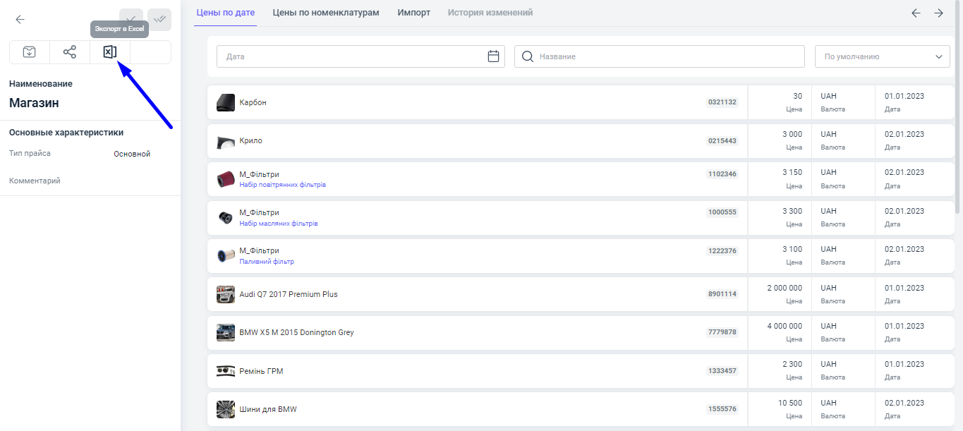 2. В левой части карточки, над секциями, нажать на иконку "Экспорт в Excel".