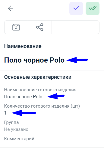 - Наименование готового изделия
