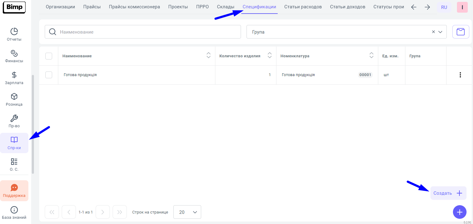2. Затем, необходимо создать спецификацию для загрузки в нее информации о материалах из шаблона, для этого переходим в блок Справочники раздел Спецификации и нажимаем кнопку "Создать".