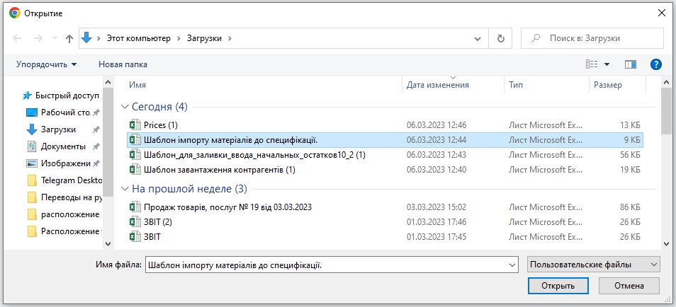 После нажатия кнопки "Импорт" перед нами открывается окно нашего компьютера, где необходимо выбрать заполненный ранее шаблон, и нажать на кнопку "Открыть".
