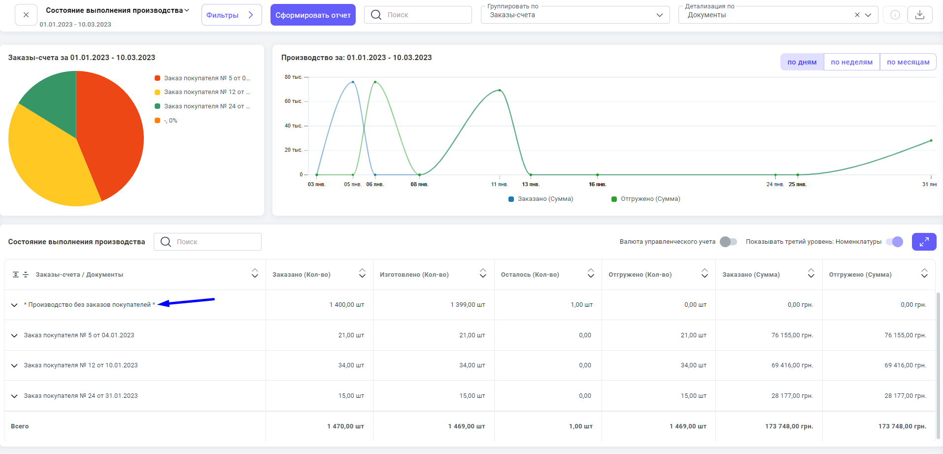 Если выбрать группировку по "Заказ - счет", то "Заказы производства" созданные НЕ на основе "Заказа покупателя" группируются в строку с пометкой * Производство без заказов покупателей *