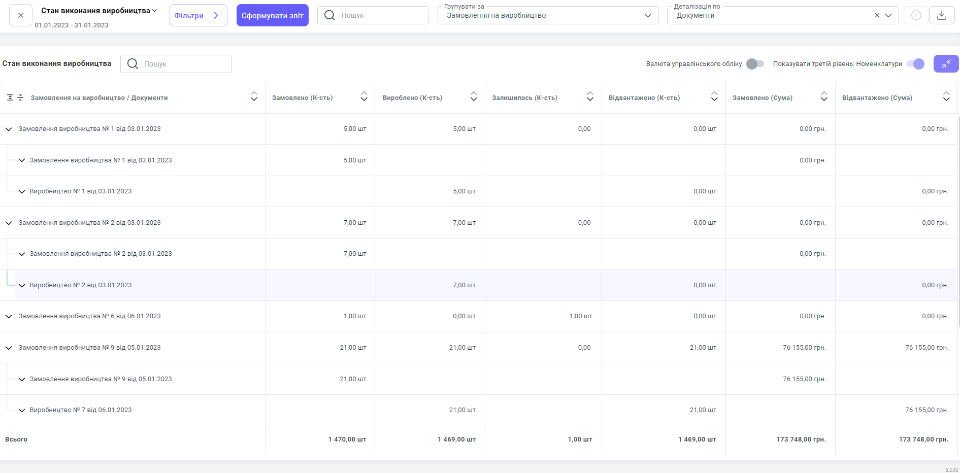 Пример наполненного информацией отчета "Состояние выполнения производства"⮭