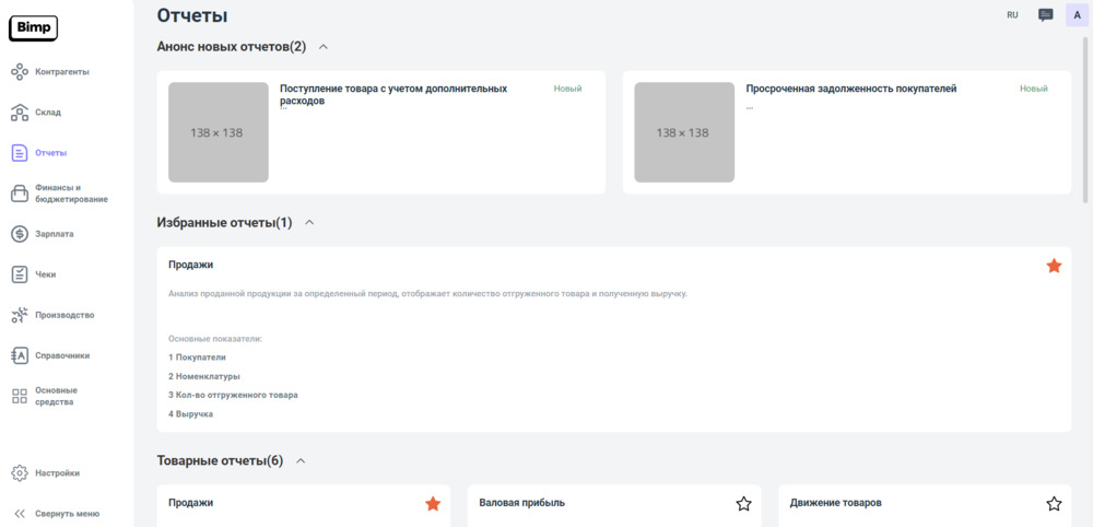 - Финансовые отчеты - отображаются отчеты, которые отображают данные по финансовой ситуации в компании.