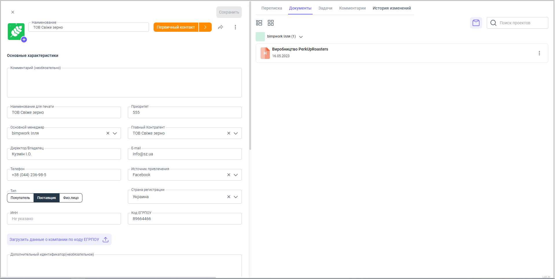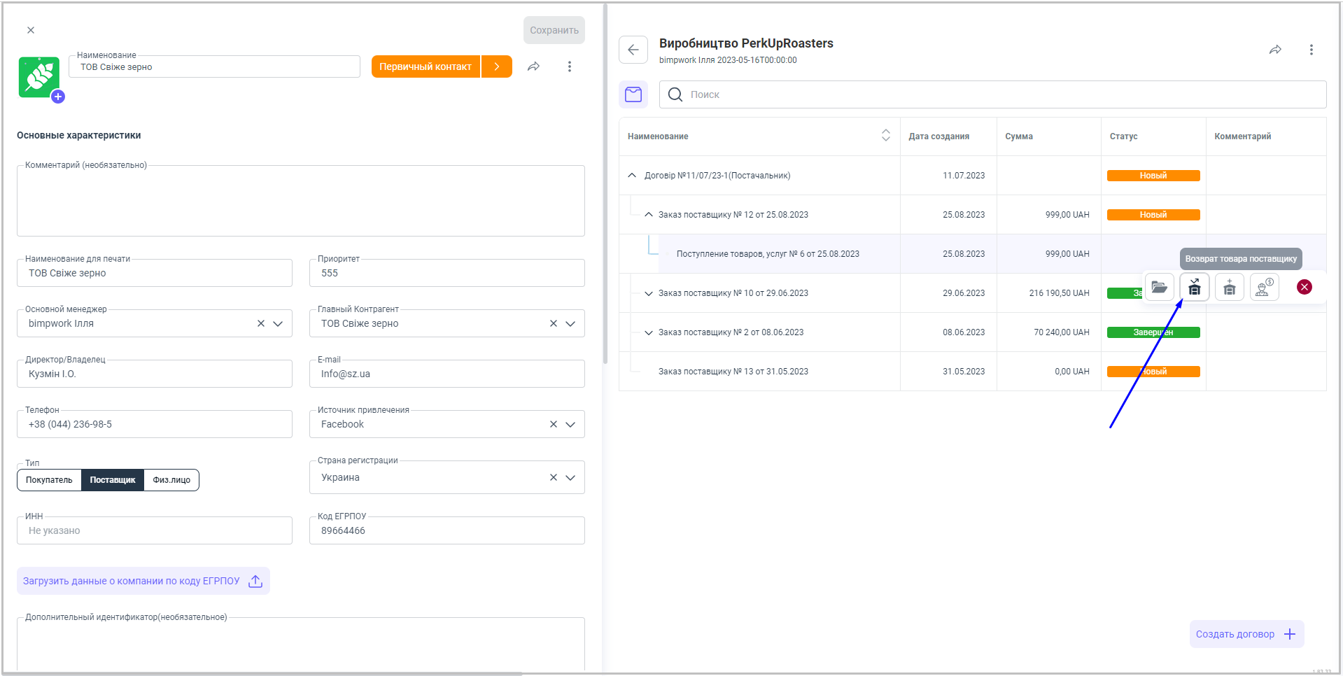 1. Переходим в блок "Контрагенты", открываем карточку необходимого нам поставщика.