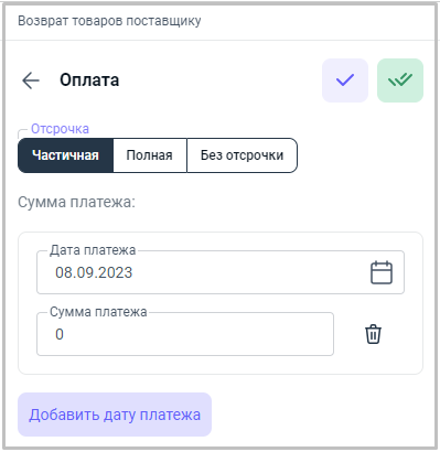 - Полная - означает, что оплата поставщику за товар/услугу будет произведена с отсрочкой на всю реализуемую сумму товара/услуги и необходимо указать, какого числа поступит платеж.