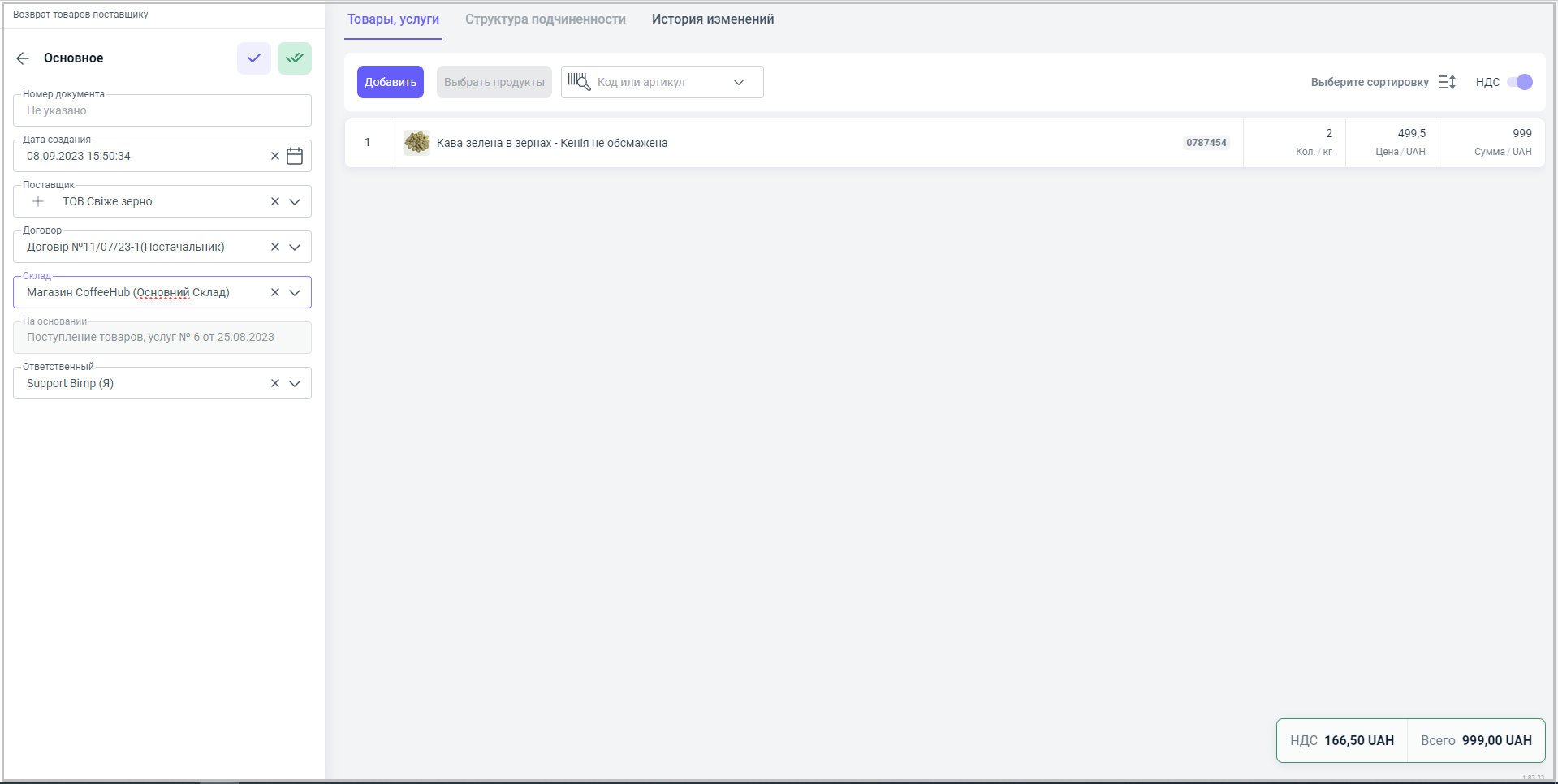 4. После нажатия перед нами открывается рабочее поле документа "Возврат товара поставщику".