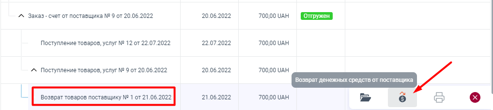 Документ "Возврат денежных средств от поставщика" мы можем создать на основе документов "Оплата поставщику".