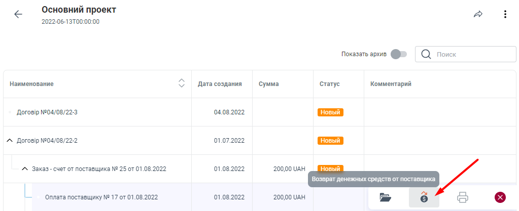 3. В самом Проекте выбираем Договор на основе которого уже создали ранее документы "Заказ-счет от поставщика" → "Поступление товаров, услуг"→ "Оплата поставщику"→ "Возврат поставщику".