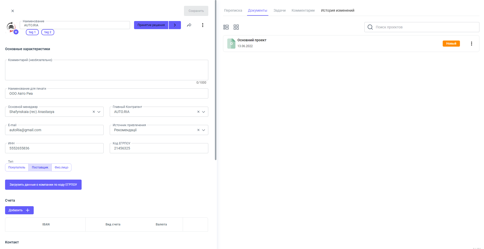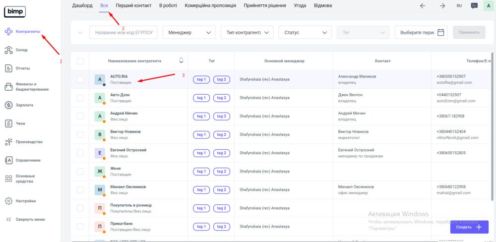 1. Переходим в блок Контрагенты, раздел Все открываем карточку необходимого нам поставщика.