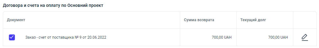В поле Оплата, указано на какой счет/кассу проводится возврат денежных средств (автоматически столбцы заполняются из заказ-счета, но Вы можете изменить их показатели с помощью виджета )
