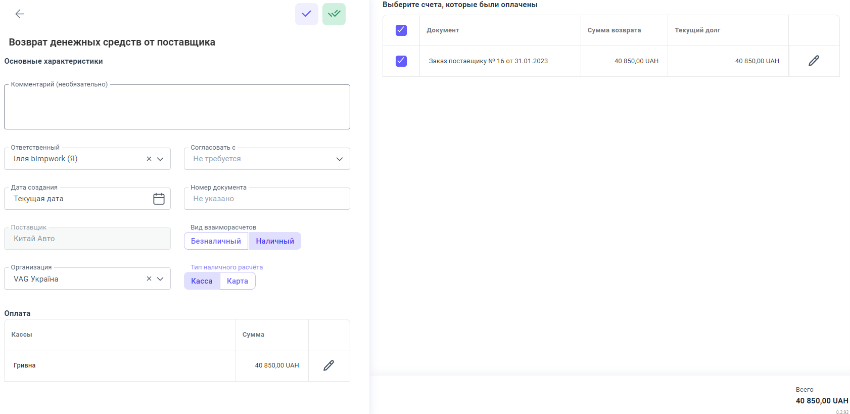 6. В правую часть документа "Возврат денежных средств от поставщика", автоматически переноситься информация с документа "Оплата поставщику" или "Возврат поставщику", зависит от того на основе какого документа создан возврат.