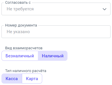 При выборе наличного вида взаиморасчетов, появляется поле Тип наличных - Касса или Карта. Необходимо выбрать, как ваша организация будет проводить оплату - из кассы организации или с ее банковской карты.