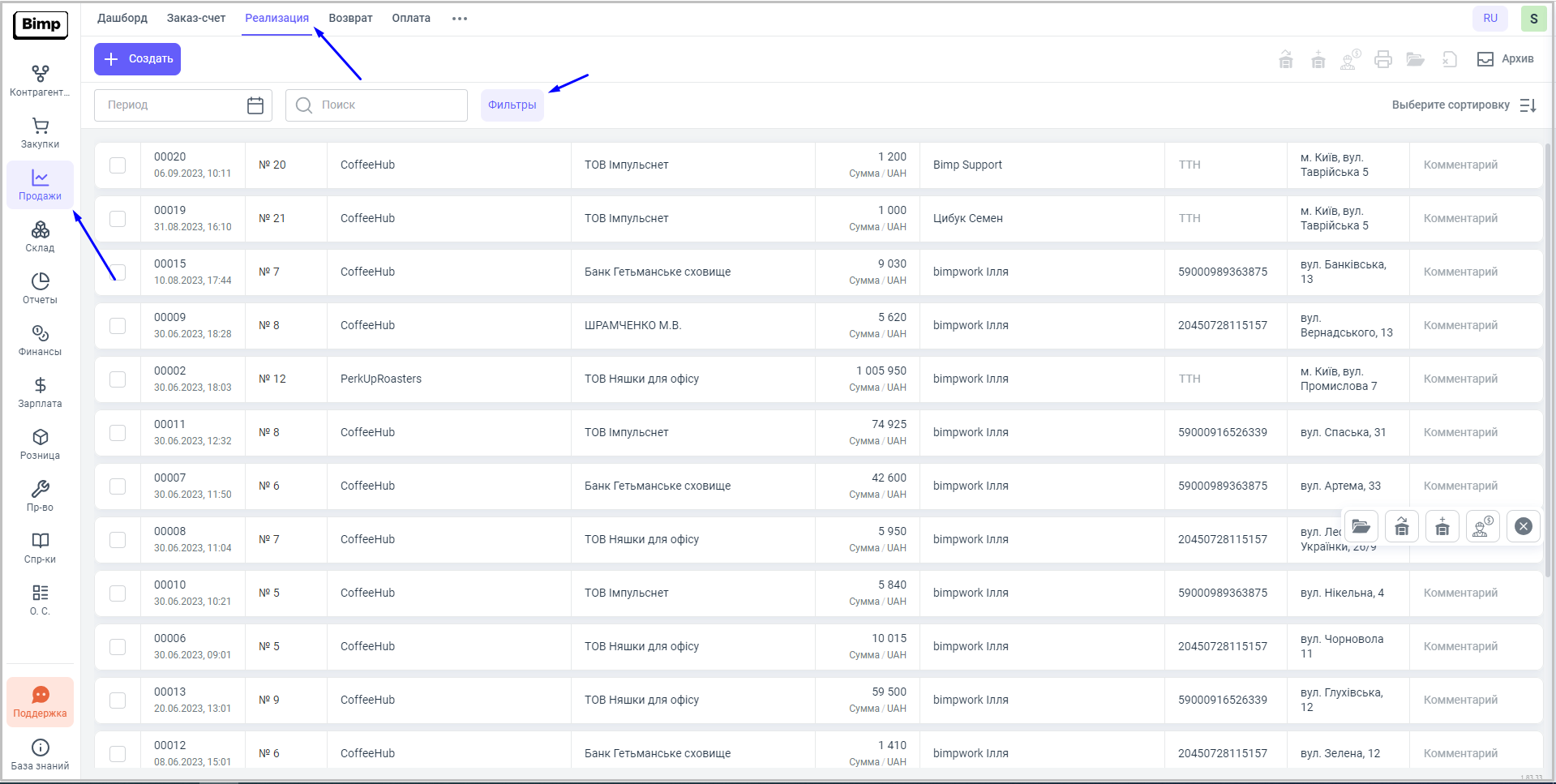 Данный документ можно создать через блок Контрагенты ➞ Карточка контрагента, а также через блок Продажи раздел Реализация.