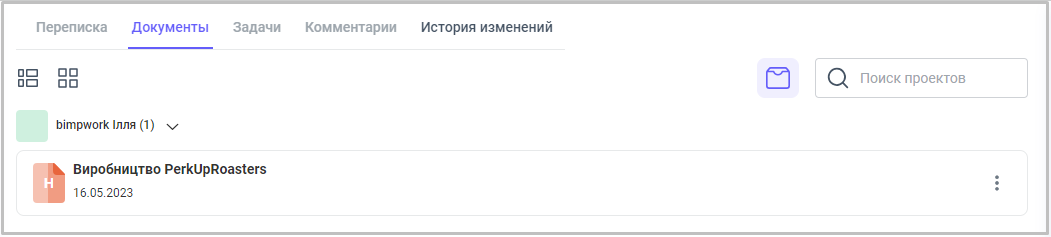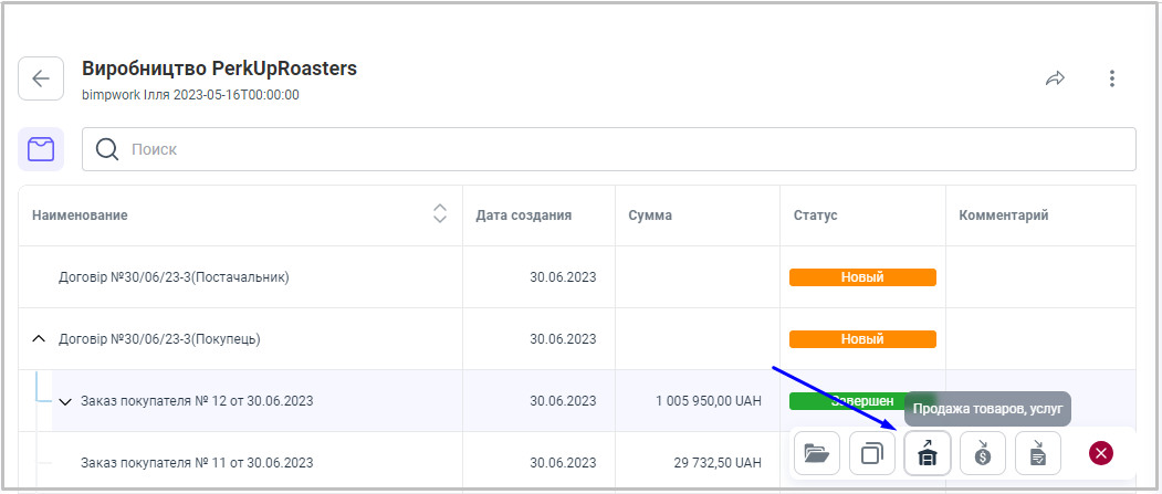 3. В самом Проекте выбираем Договор на основе которого уже создали ранее документ "Заказ-счет покупателю". Наводим мышкой на необходимый счет, и справа у нас появляется всплывающее окно с несколькими виджетами. Нажимаем на виджет создание документа "Продажа товаров, услуг".