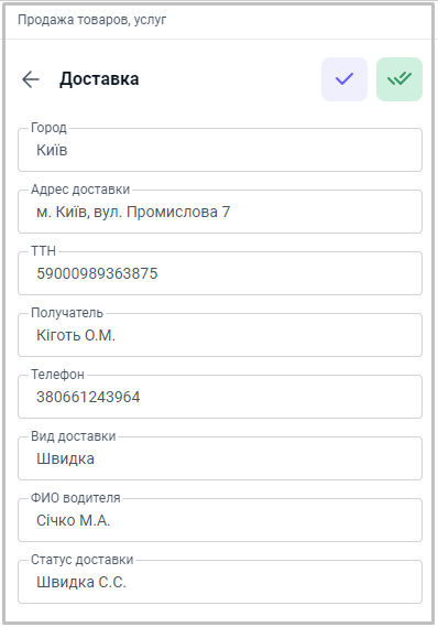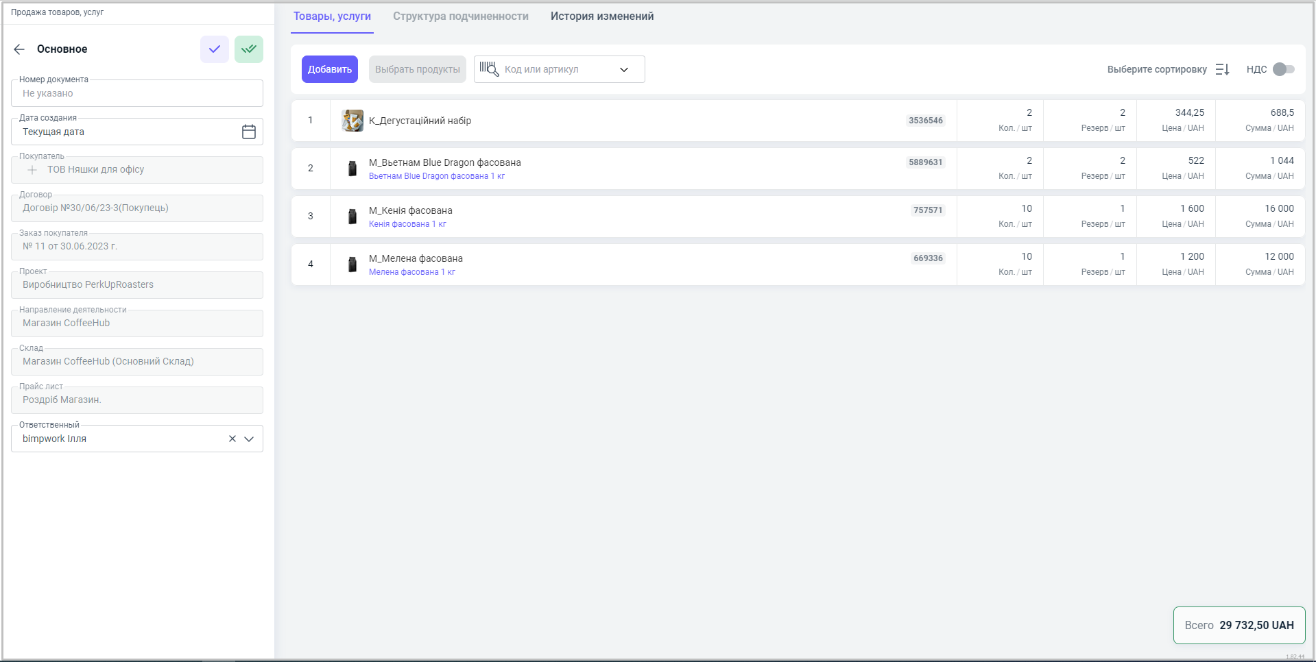 - Строки Покупатель, Договор, Заказ покупателя, Проект, Направление деятельности, Склад, Прайс-лист – заполняются автоматически со счета на основе которого создана продажа;