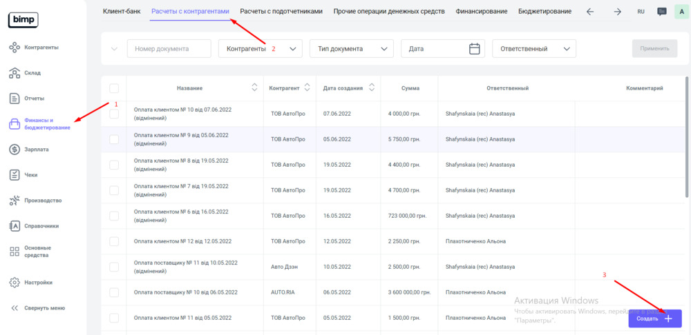 1. Переходим в блок Финансы и бюджетирование раздел Расчеты с контрагентами, и нажимаем на кнопку "Создать".