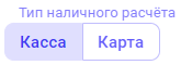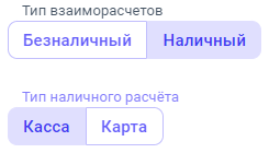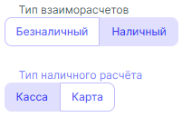 Переключатель Тип наличного расчета - появляется при выборе Наличного типа взаиморасчетов. Необходимо указать с какой кассы/карты производится оплата.