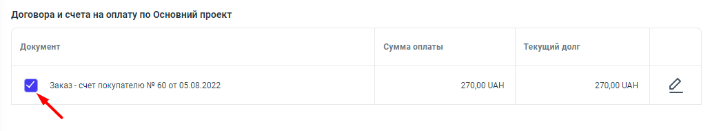 Чтобы, подтянуть сумму заказ-счета к оплате необходимо, навести курсор мышки к виджету  в строку необходимого счета, и нажать на него . Сумма подтянется к документу об оплате.