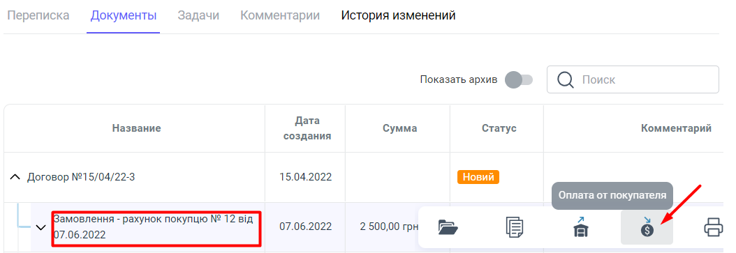 3. В самом Проекте выбираем Договор, потом заказ-счет который хотят оплатить. Наводим курсор на необходимый заказ-счет, и справа у нас появляется всплывающее окно с несколькими виджетами. Нажимаем на виджет создание документа "Оплата от покупателя".