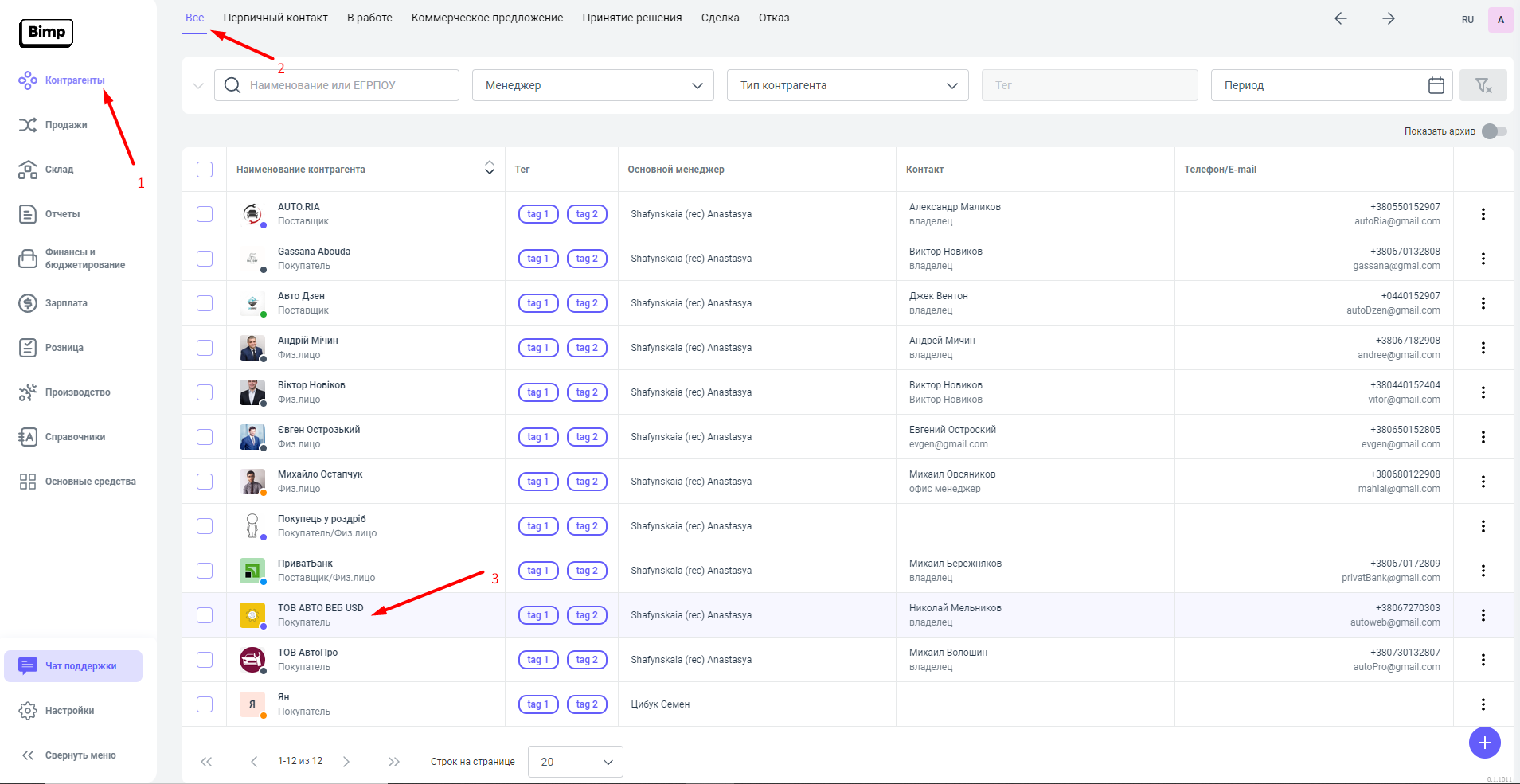 1. Переходим в блок Контрагенты, раздел Все открываем карточку необходимого нам покупателя.