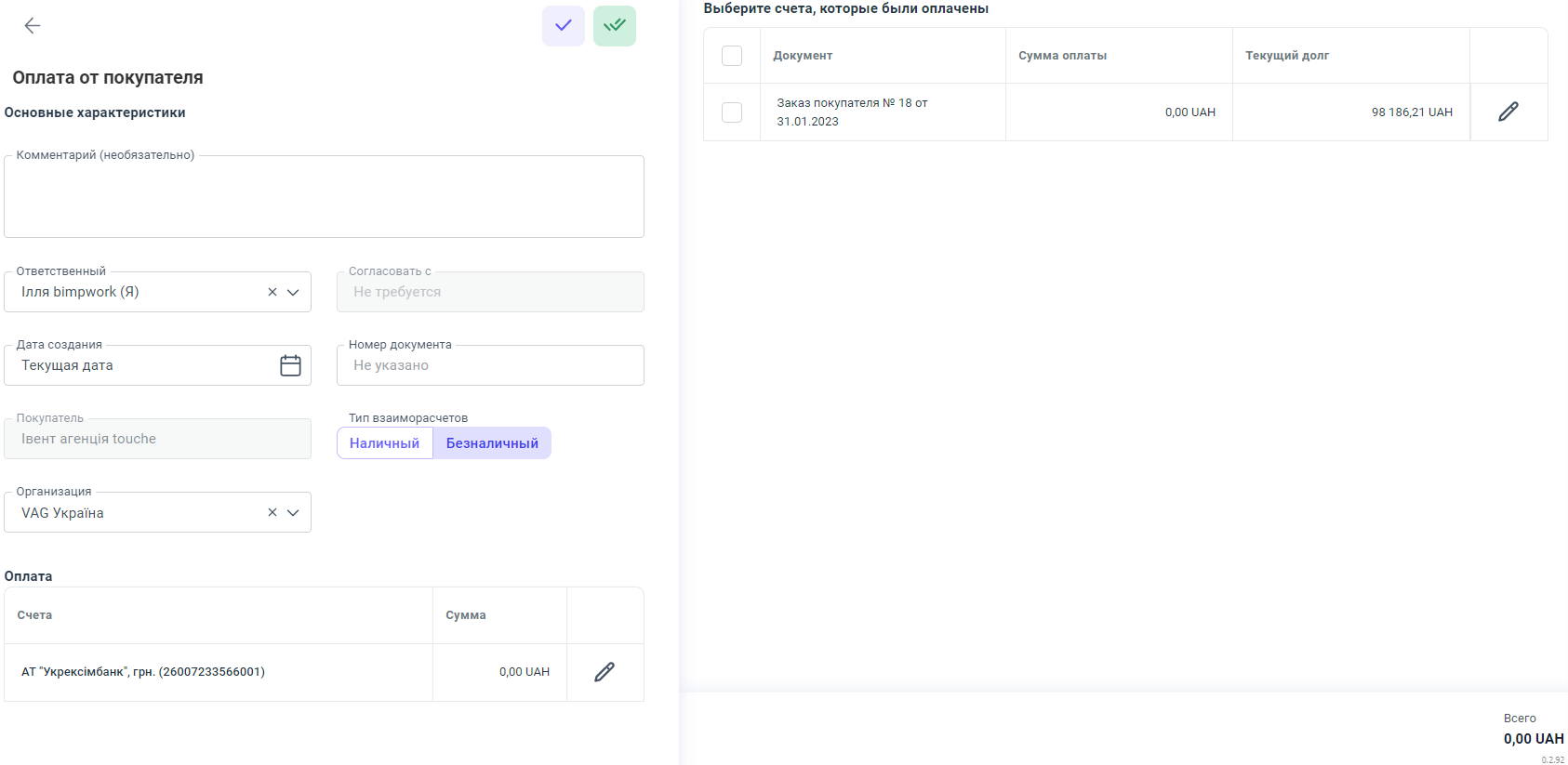 Переключатель Тип взаиморасчетов - автоматически выбирается согласно информации в заказе-счете, на основе которого создана оплата. Если нужно, тип можно изменить и провести оплату тем типом взаиморасчетов который нужно не меняя его в заказ-счете.