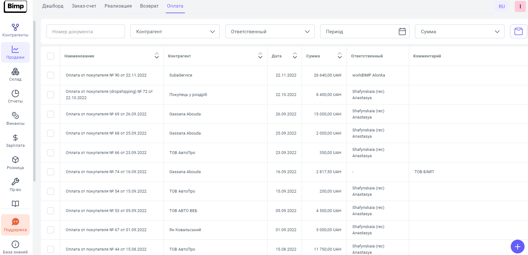 Документы "Оплата от покупателя" по всем заказам от покупателей, отображаются в специальном для этого разделе Оплаты блока Продажи.