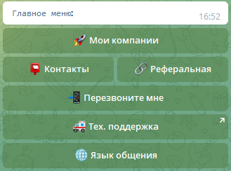 Кнопка "Главное меню" в чат-боте сервиса Bimp, содержит в себе весь функционал доступный пользователю.