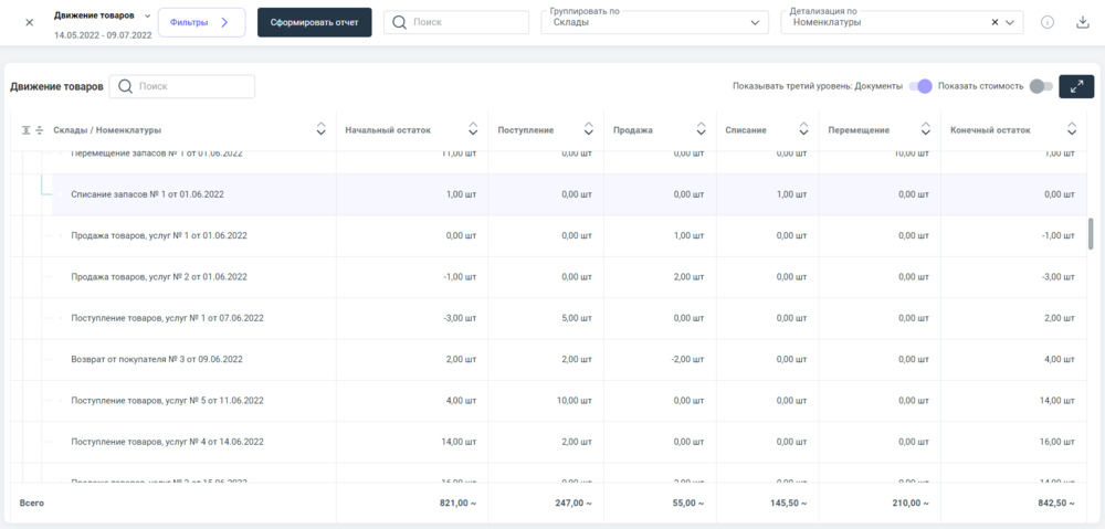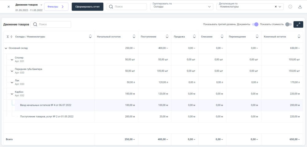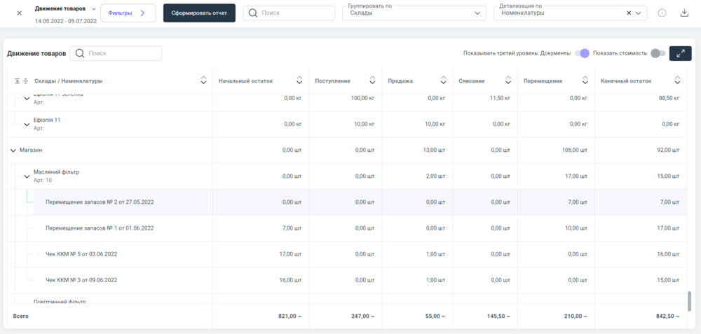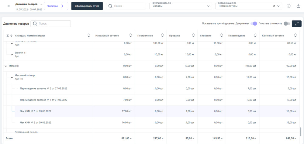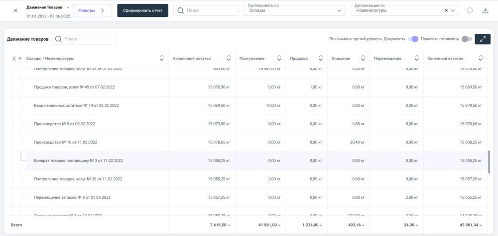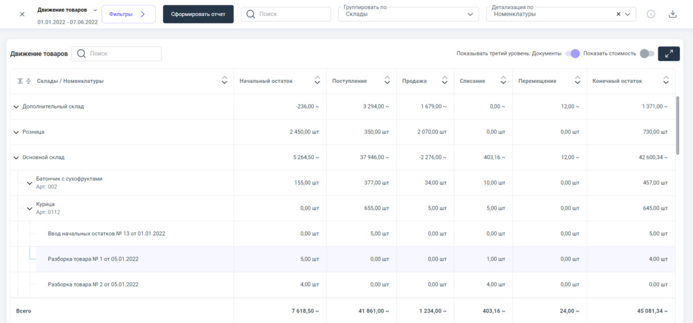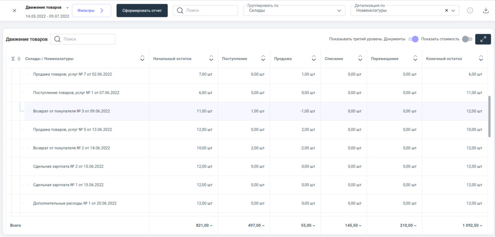 Пример наполненного информацией отчета "Движение товаров"⮭
