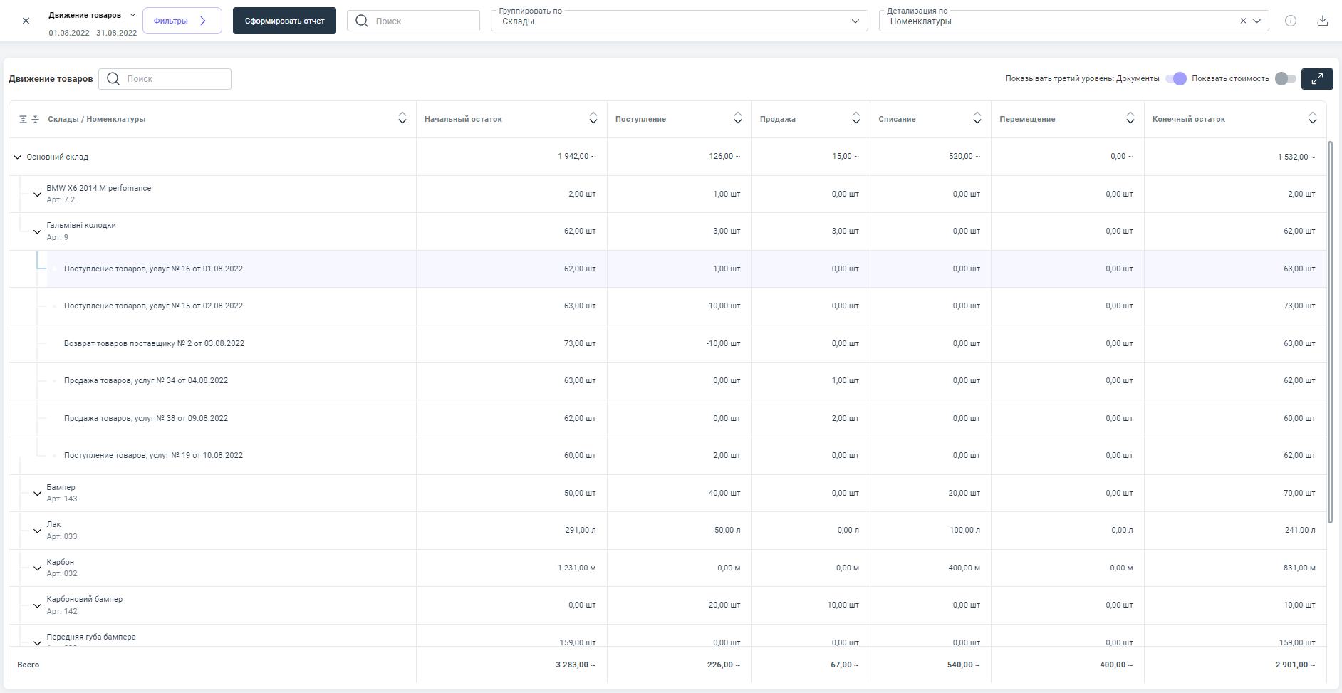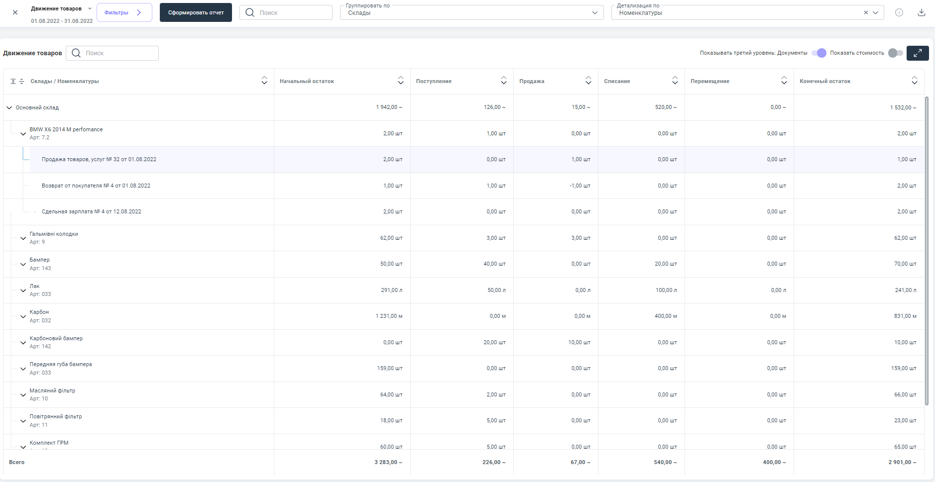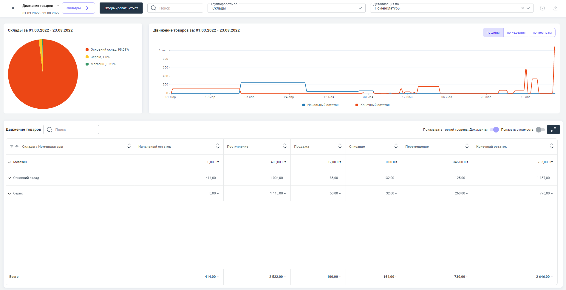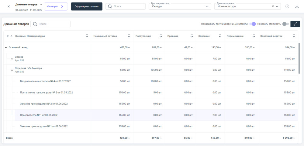 Основные показатели отчета: начальный остаток товара, количество поступившего товара, количество реализованного товара и конечный остаток товара по складам.