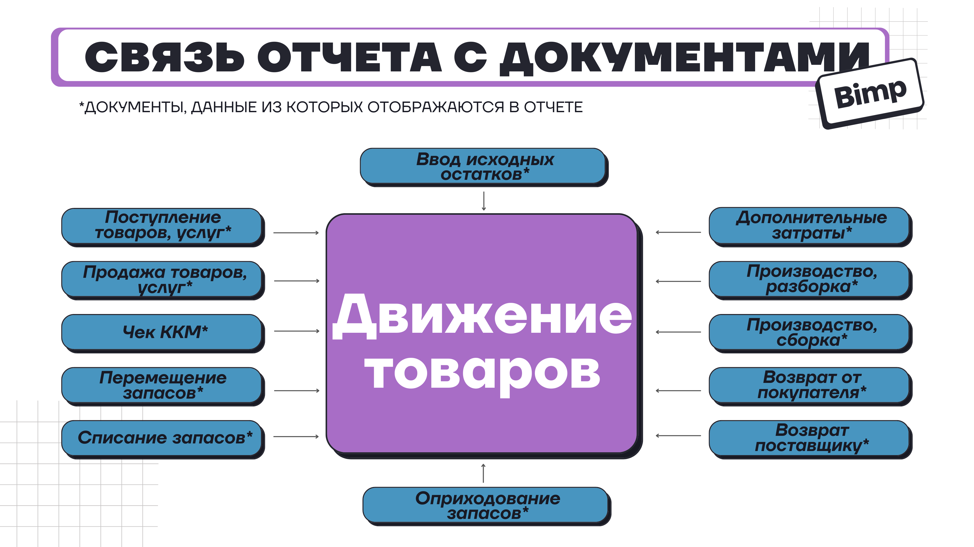 Отчет отображает - количество товара поступившего на склады компании; количество реализованного и списанного товара; перемещение товара между складами нашей компании; конечный остаток товаров по всем складам.