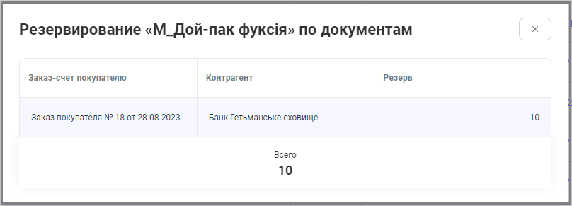 2. В столбце Остаток на складах, при нажатии на число 2497 / 10 можно увидеть такую информацию увидим каким документом проведен резерв, количество единиц резерва и контрагент.