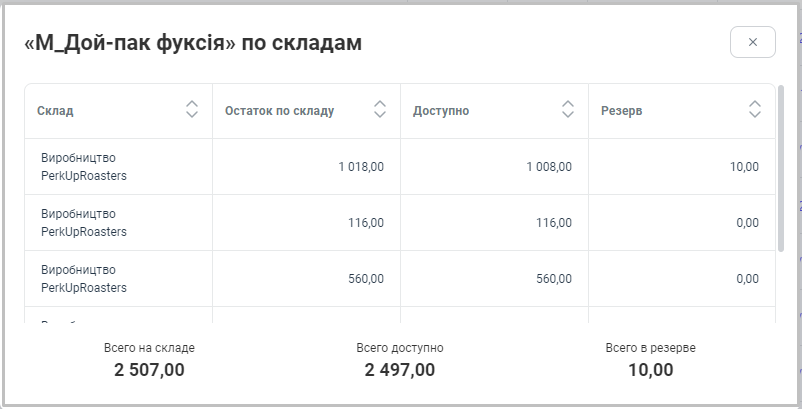 Если, нажать на число "2497" в столбце Доступно/Резерв, ми увидим: