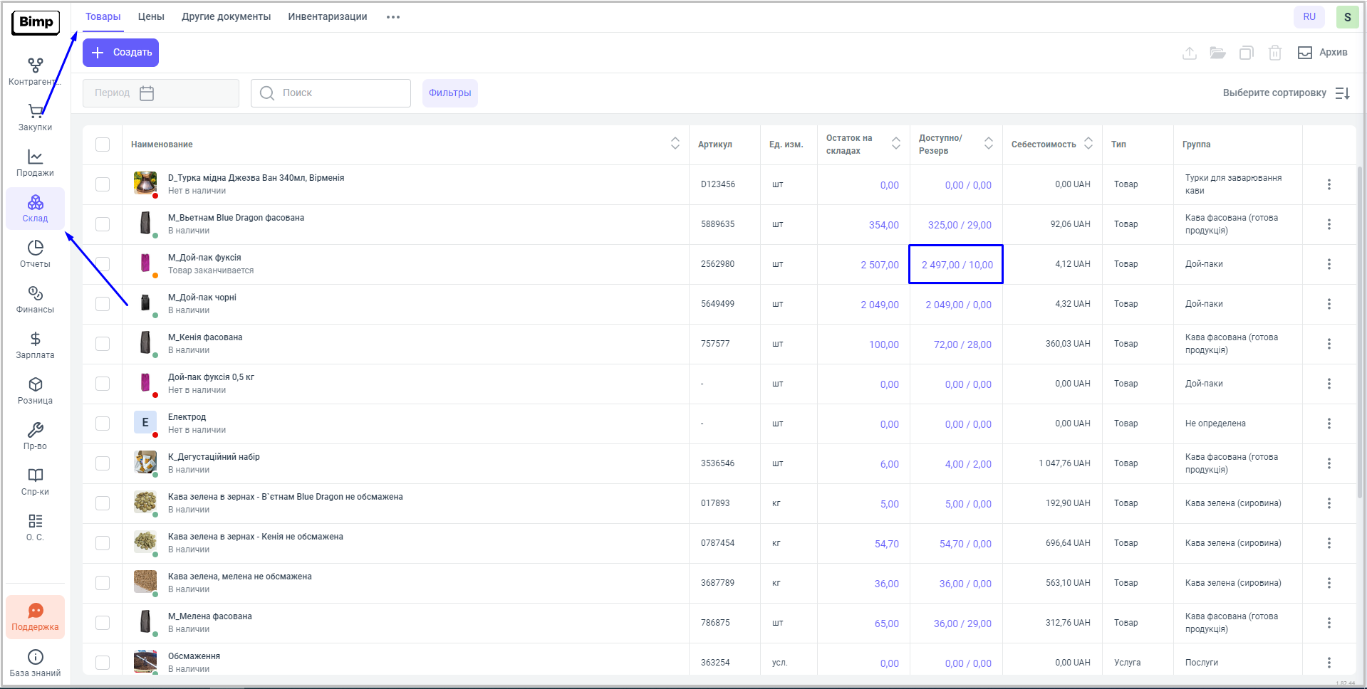 1. Резерв товаров мы можем посмотреть в блоке "Склад", в разделе "Товары".