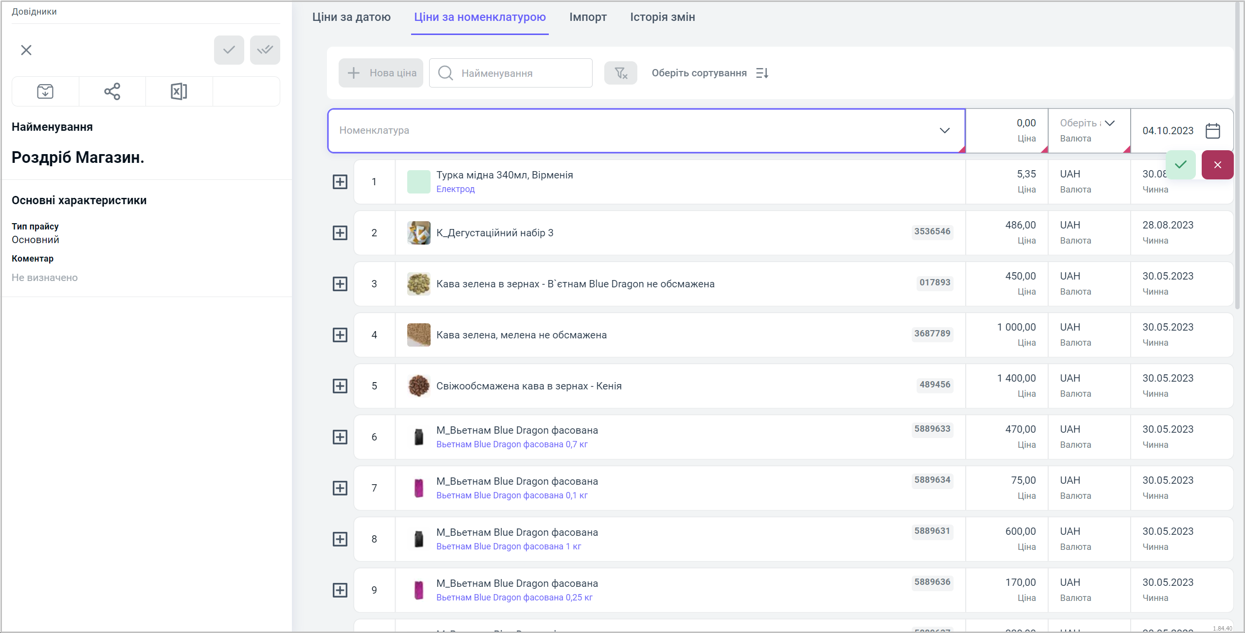 - Вкладка Ціни за номенклатурами — необхідна для відображення актуальних на поточний день цін на товари/послуги, а також для відображення всіх попередніх цін на товар/послугу, зазначених раніше в прайсі.