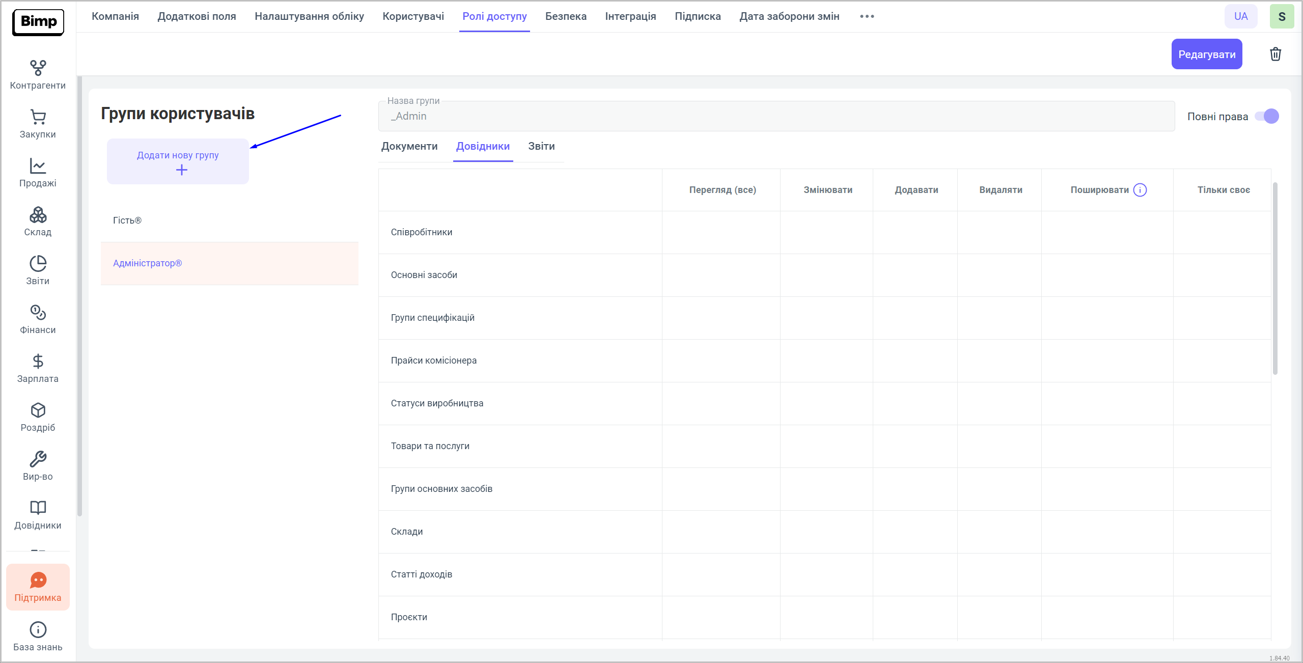 5. Далі переходимо у вкладку Користувачі, де кожного користувача відносимо до певної групи, раніше створеної у розділі Ролі доступу. Натискаємо на віджет "Редагувати" та вибираємо необхідний пункт.